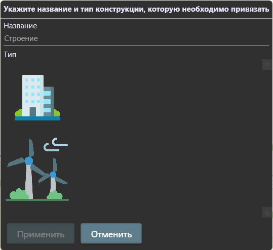 Укажите название, выберите тип строения и нажмите 'Применить'.
